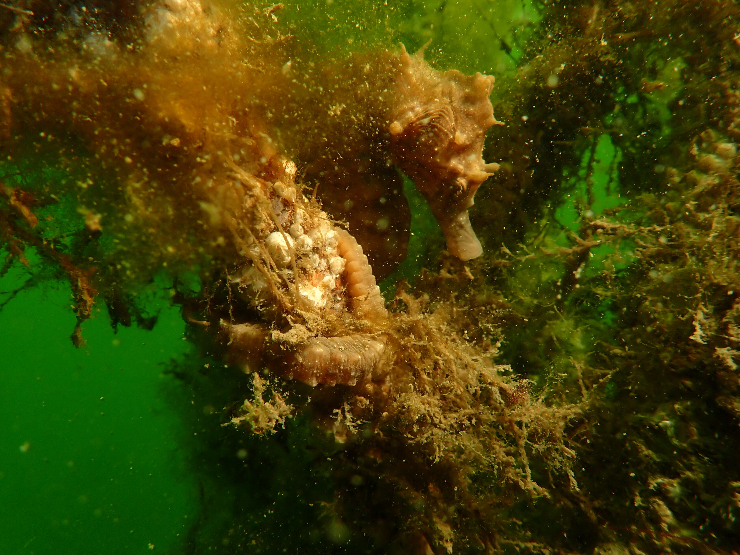 Na een boterham op de camping gingen we naar de volgende duikstek, de Zeelandbrug. Het was er een stuk rustiger dan we verwacht hadden. Dat scheelt, hoeven we niet een mega stuk te lopen met de zware duikuitrusting. Het plan was om naar de eerst pijler te gaan en daar een ronde omheen te zwemmen. Voordat we te water gingen hoorden we andere duikers praten over een zeepaardje. We hoopten dat we die ook zouden zijn. En ja hoor, we hebben het zeepaardje gespot! ’s Avonds sloten we de dag af met een gezellige barbecue op de camping.
